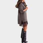 Komplet vključuje oversized pleten pulover z visokim ovratnikom, ki je mehak, topel in sproščenega kroja – idealen za ležeren slog. Pulover dopolnjuje lahka in nežna slip obleka z okrasnim slojem čipkastega tila na spodnjem robu, ki videzu doda gibanje, prefinjen čar in diskreten pridih zapeljivosti.