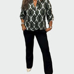 Ženska **vsakdanja srajca z modernim geometrijskim potiskom** v olivno zeleni in belih odtenkih. Njena sproščena zasnova v kombinaciji s zavihanimi rokavi nudi udobje in eleganco, kar jo naredi idealno za casual, pa tudi bolj formalne priložnosti.