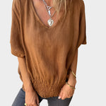 Pokažite svoj vsakdanji slog s to neustavljivo udobno majico v naravni rjavi barvi. Z ohlapnim krojem in diskretno V-izrezom združuje preprostost in eleganco za vsako priložnost.