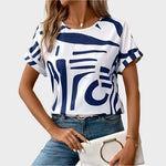Elegantna majica z modernim abstraktnim vzorcem v modrih in belih odtenkih. Idealni kos za vsakodnevne stajlinge, ki izstopajo.