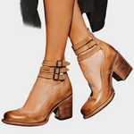 Osvežite svoj stil z usnjenimi rjavimi škornji s širokim peto. Par, ki združuje eleganco in udobje, idealno za casual chic in boho videze.