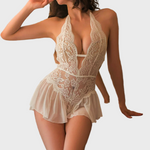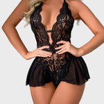 To senzualno čipkasto bodi v črni barvi združuje čipko in prosojnost za popolnoma ženstven in zapeljiv učinek. Oblika s drznimi odprtinami in cvetličnimi detajli poudarja silhueto, medtem ko kratka volančka na dnu dodaja igrivo eleganco.