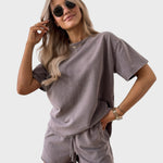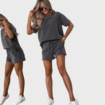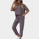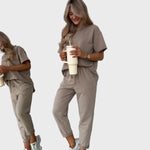 Ta udoben komplet dveh delov v mehki sivi barvi združuje stil in udobje, idealen za vsakodnevne videze. Minimalistična zasnova nudi eleganco, ne da bi žrtvovala udobje.