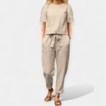 Osveži svojo poletno garderobo s tem elegantnim in udobnim dvoslojnim kompletom, idealnim za vroče dni in sveže večere. Sestavlja ga lahka bluza in široke hlače s pasom, ki nudita udobje in stil ob vsaki priložnosti.