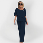 Naš priljubljeni komplet je popolna izbira za elegantne nastope z udobjem in stilom – idealen za ženske, ki želijo v vsakem trenutku čutiti samozavest. Moderna zasnova z asimetrično bluzo in ravnimi hlačami ustvarja brezčasno podobo, ki ustreza vsem starostnim skupinam.