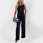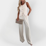 • Elegantna podoba – Dobro šivan brezrokavnik s gumbi in hlače v ravni silhueti zagotavljajo prefinjeno in ženstveno prisotnost.