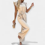 Ta kombinezon združuje eleganco in udobje, pritegne pozornost z detajli, kot so metuljasti rokavi in pas, ki poudari pas. Idealna za uradne ali casual priložnosti, je nujna izbira.