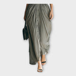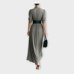 Obleka s srajčnim izrezom, ki združuje rafinirano estetiko s praktičnostjo, nudi brezskrbno eleganco ob vsaki priložnosti. Njena prilagodljiva zasnova jo naredi idealno za vse priložnosti, od vsakodnevnih do bolj posebnih, medtem ko ohlapen kroj zagotavlja udobje in svobodo gibanja. S svojo minimalistično linijo predstavlja brezčasno oblačilo, ki se enostavno prilagodi vsakemu slogu.
