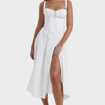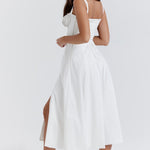 Poletna obleka z bodicem, ki združuje ženskost in udobje. Prilegajoča se linija na zgornjem delu poudari dekolte, medtem ko zračna krila nudijo gibanje in svež občutek. Idealna za poletne sprehode, počitnice in elegantne vsakdanje videze.