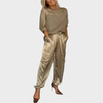 Satinasti komplet z ohlapno majico in cargo hlačami