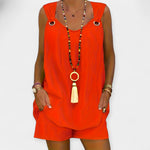 Popoln poletni chic komplet, ki združuje svežino in eleganco. Brezrokavnik z V-izrezom subtilno poudari dekolte, medtem ko kratke hlače nudijo udobno prileganje in ženstveno silhueto. Moderni set za vsak trenutek dneva.