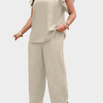 Set v lila barvi s širokimi hlačami in bluzo z volančki na rokavih združuje stil in udobje, idealno za vsako priložnost – od popoldanske sprehode do posebnih izhodov.