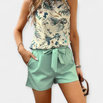 Osvežite svojo garderobo s tem svetlim in svežim setom, idealnim za vroče pomladne in poletne dni. Halter top ponuja moderen kroj, ki poudarja ramena, medtem ko ujemajoče kratke hlače z pasom zagotavljajo stil in udobje pri vaših vsakodnevnih izletih.