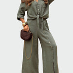 Ženska **kombinacija** v olivno zeleni barvi s sofisticirano in udobno zasnovo, ki izžareva prefinjeno eleganco. Ima **gumb na zgornjem delu**, pas, ki se zaveže v pasu za žensko silhueto, in **široke hlače z gumbi na strani**, ki ponujajo gibanje in stil. Idealna za vsakodnevne izglede, pa tudi za večerne izhode z ustreznimi dodatki.