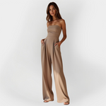Ta črn brez naramnic kombinezon je vrhunec elegance in ženstvenosti. Časovno brezčasna izbira za vsak večerni videz ali uradno priložnost.